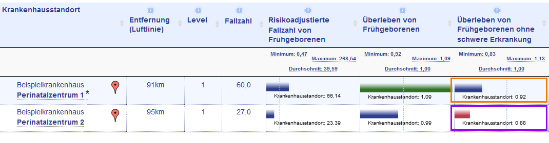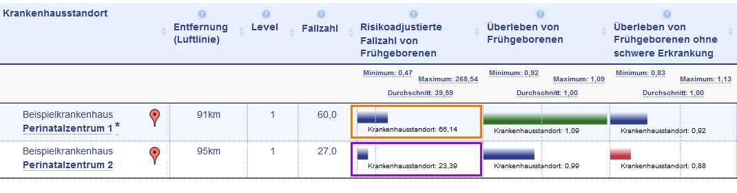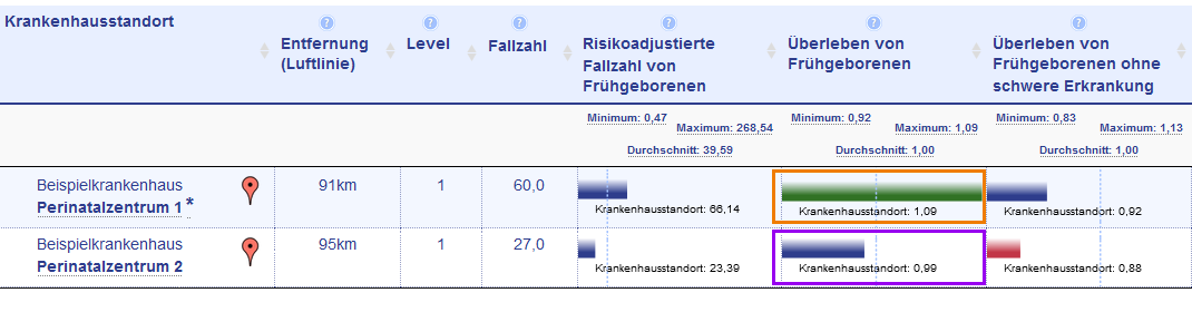 Das Perinatalzentrum 1 liegt mit 1,09 über dem Bundesdurchschnitt (1,0), das Perinatalzentrum 2 liegt mit 0,99 darunter.